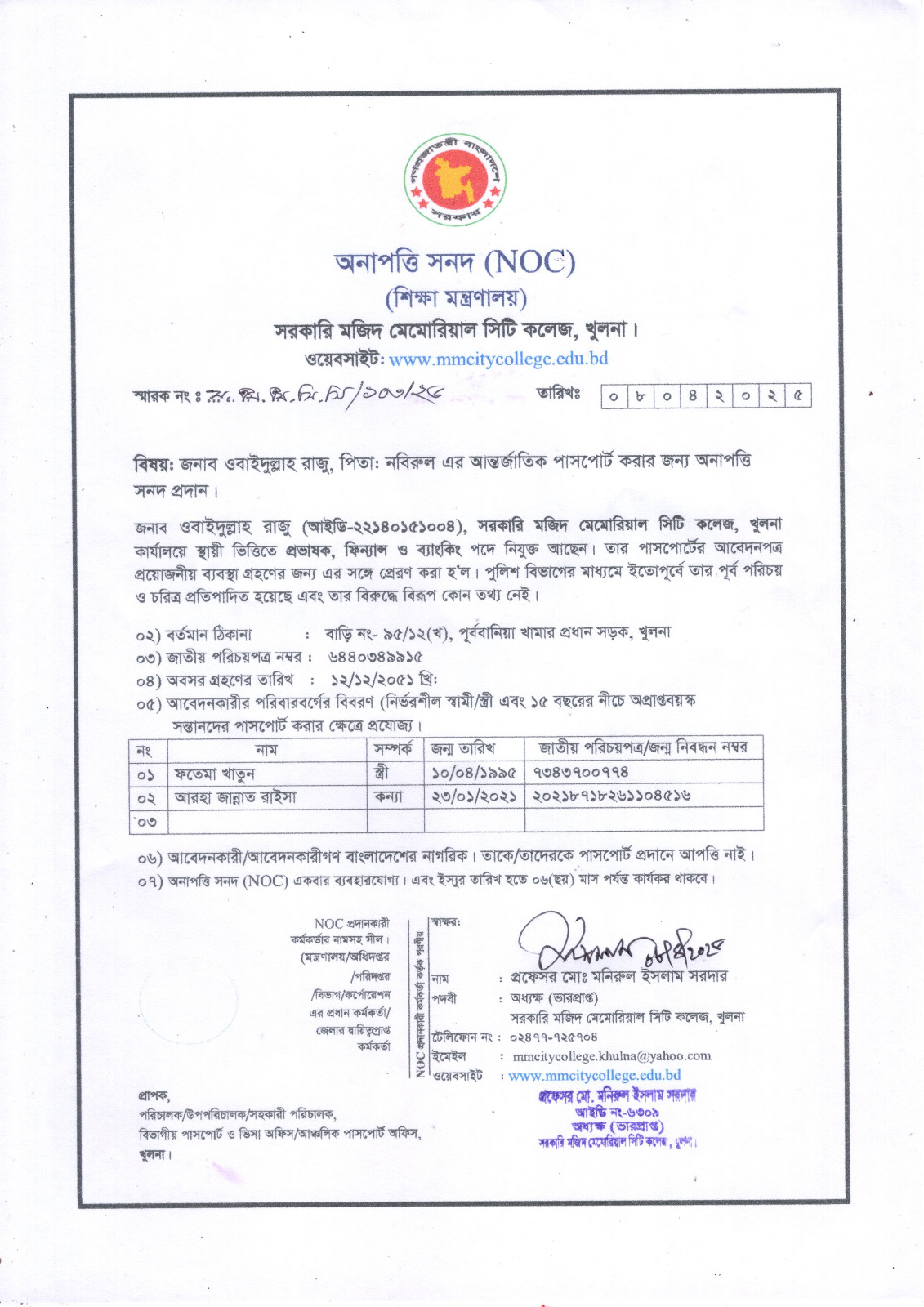 জনাব শেখ জাহিদুর রহমান এর এন ও সি |