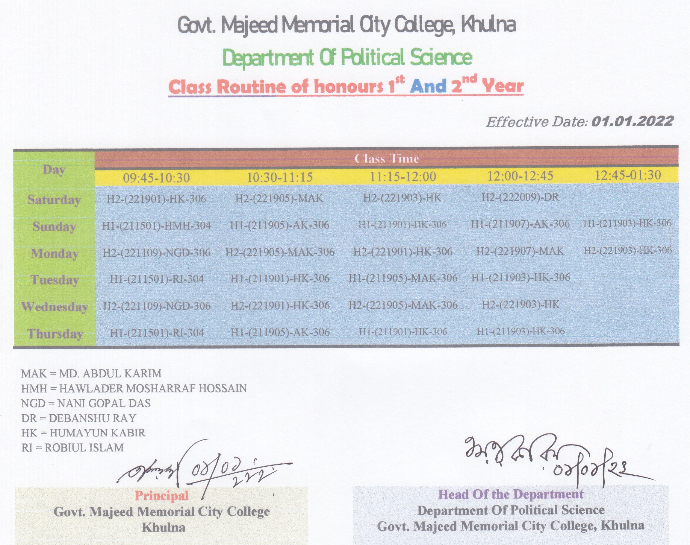 Politicl Science !st & 2nd Yr Class Routine